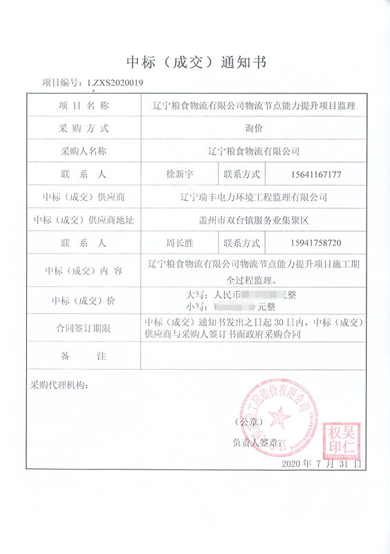中標(biāo)喜訊-遼寧糧食物流有限公司物流節(jié)點(diǎn)能力提升項(xiàng)目監(jiān)理