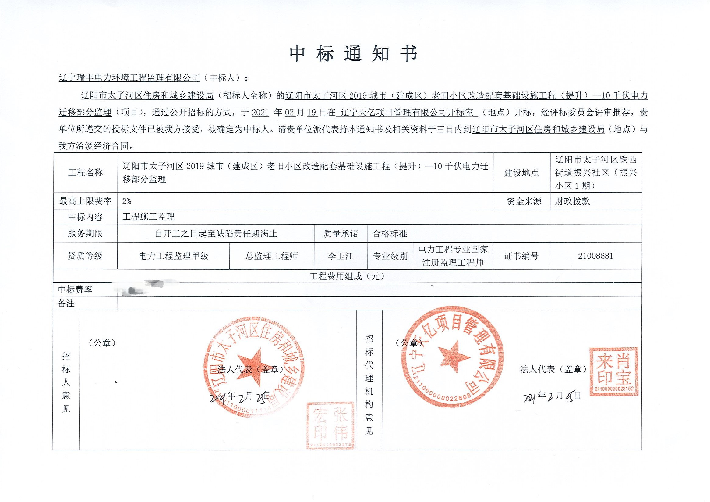 中標(biāo)喜訊-遼陽市太子河區(qū)2019城市(建成區(qū))老舊小區(qū)改造配套基礎(chǔ)設(shè)施工程(提升)—10千伏電力遷移部分監(jiān)理
