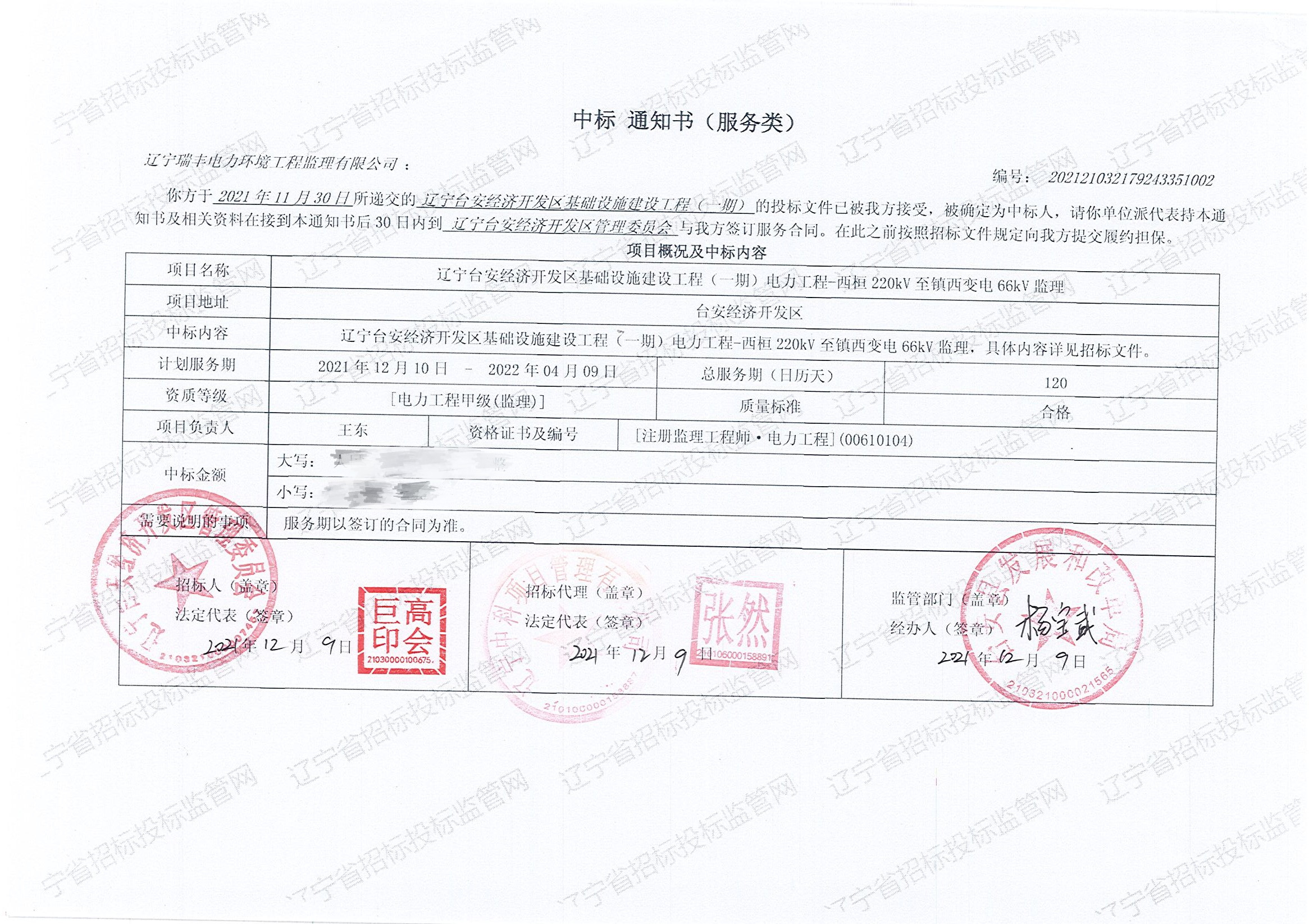 中標(biāo)喜訊-遼寧臺(tái)安經(jīng)濟(jì)開(kāi)發(fā)區(qū)基礎(chǔ)設(shè)施建設(shè)工程(一期)電力工程-西桓220kV至鎮(zhèn)西變電66kV監(jiān)理