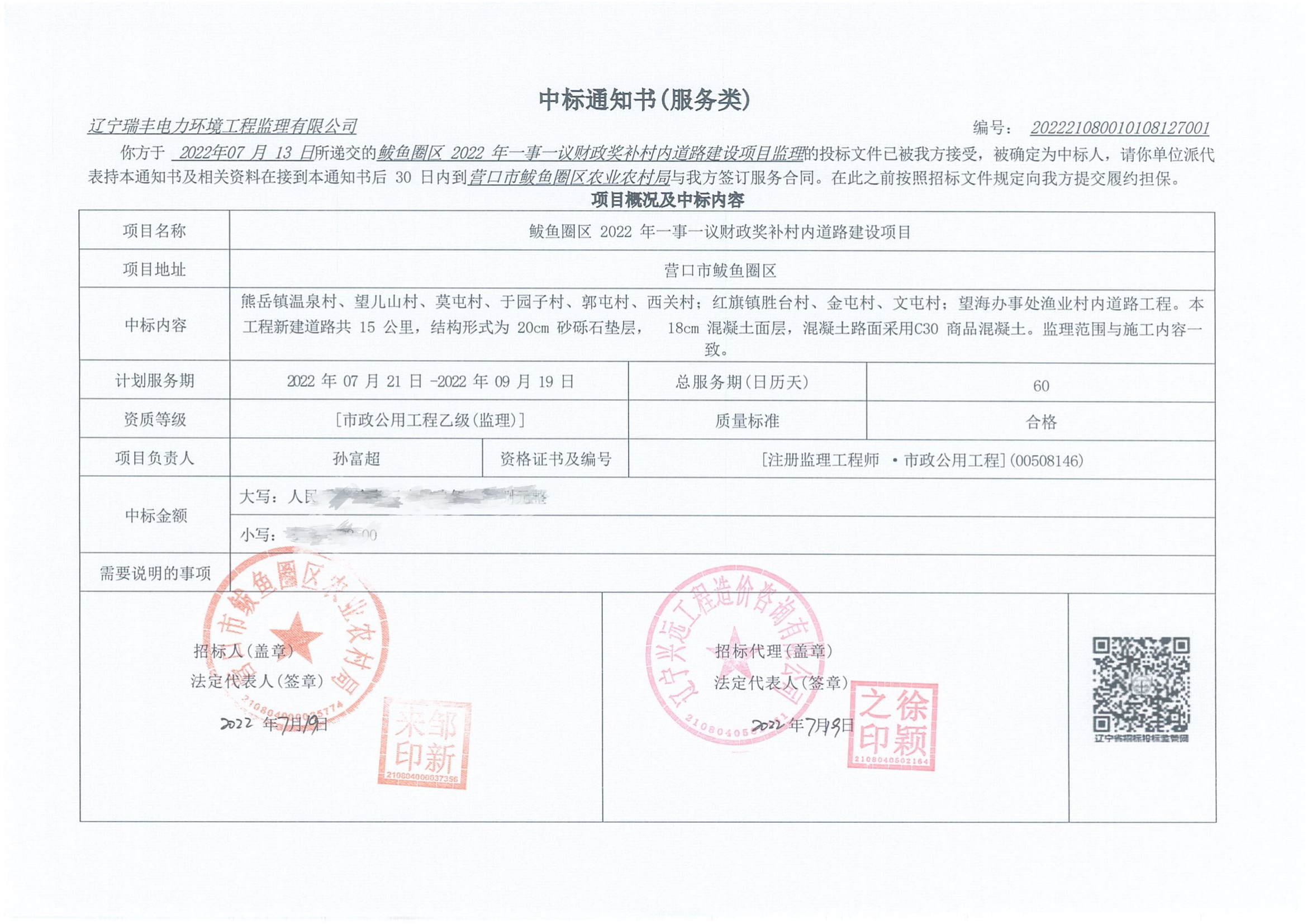 中標(biāo)喜訊-鲅魚圈區(qū)2022年一事一議財政獎補(bǔ)村內(nèi)道路建設(shè)項目
