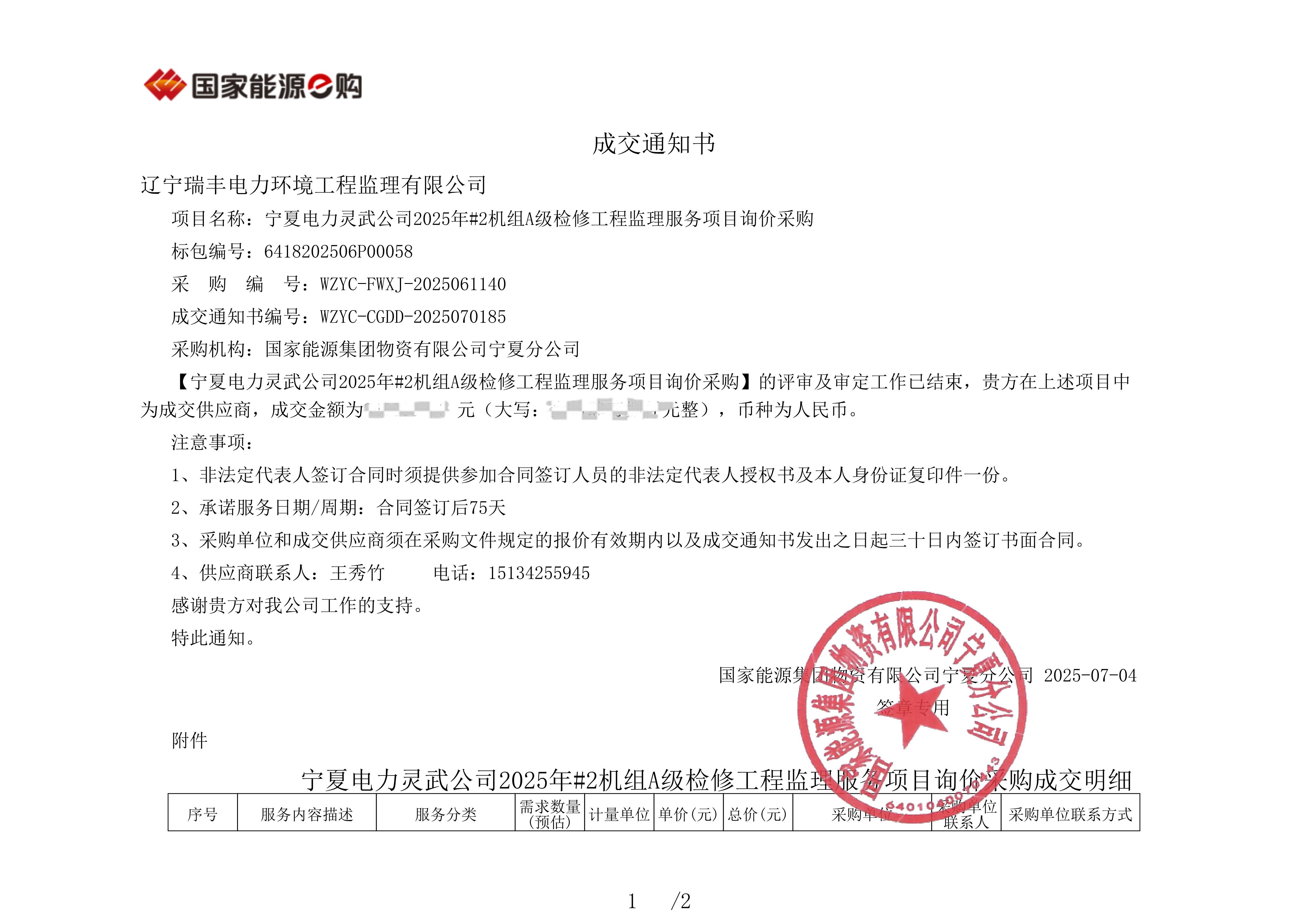 中標(biāo)喜訊-寧夏電力靈武公司2025年#2機(jī)組A級檢修工程監(jiān)理服務(wù)項(xiàng)目
