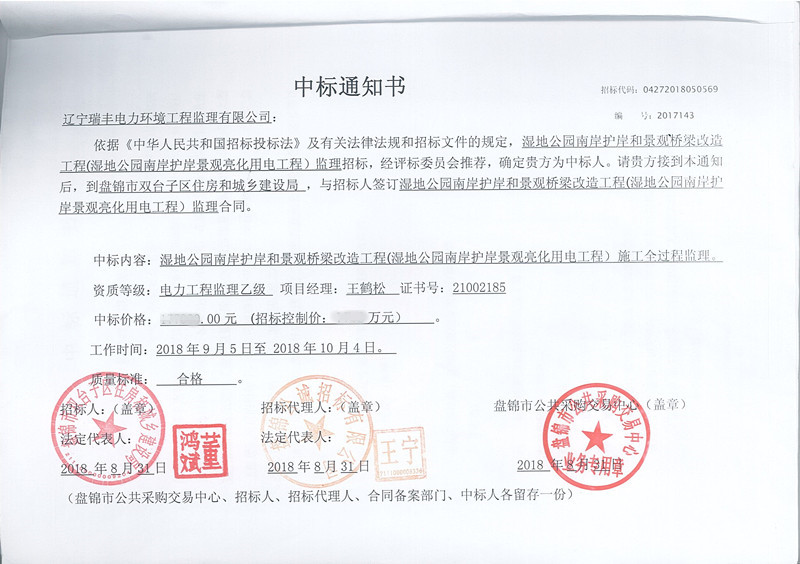 中標喜訊-濕地公園南岸、護岸和景觀橋梁改造工程(濕地公園南岸護岸景觀亮化用電工程)監(jiān)理